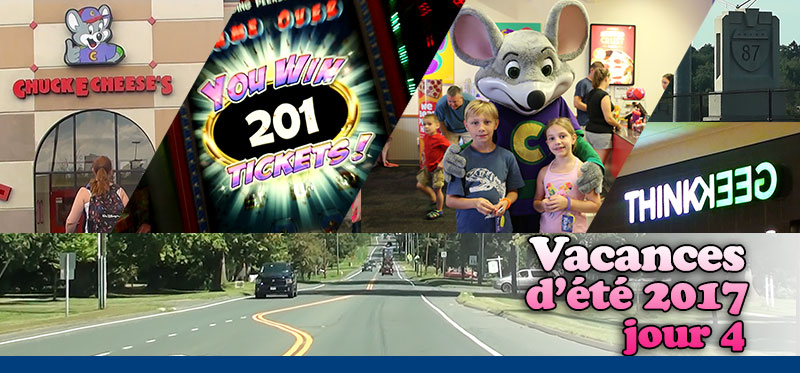 11h, nous quittons la chambre. Nous avons environ 45 minutes de route à faire pour se rendre à Chuck E. Cheese’s. Le concept de ce restaurant que nous adorons est qu’il s’agit d’une pizzeria avec arcades familiale, où on gagne des coupons que les enfants peuvent ensuite échanger pour des cadeaux. Nous avons connu ce restaurant près de Toronto et depuis, c’est un arrêt obligatoire quand on peut en croiser un.